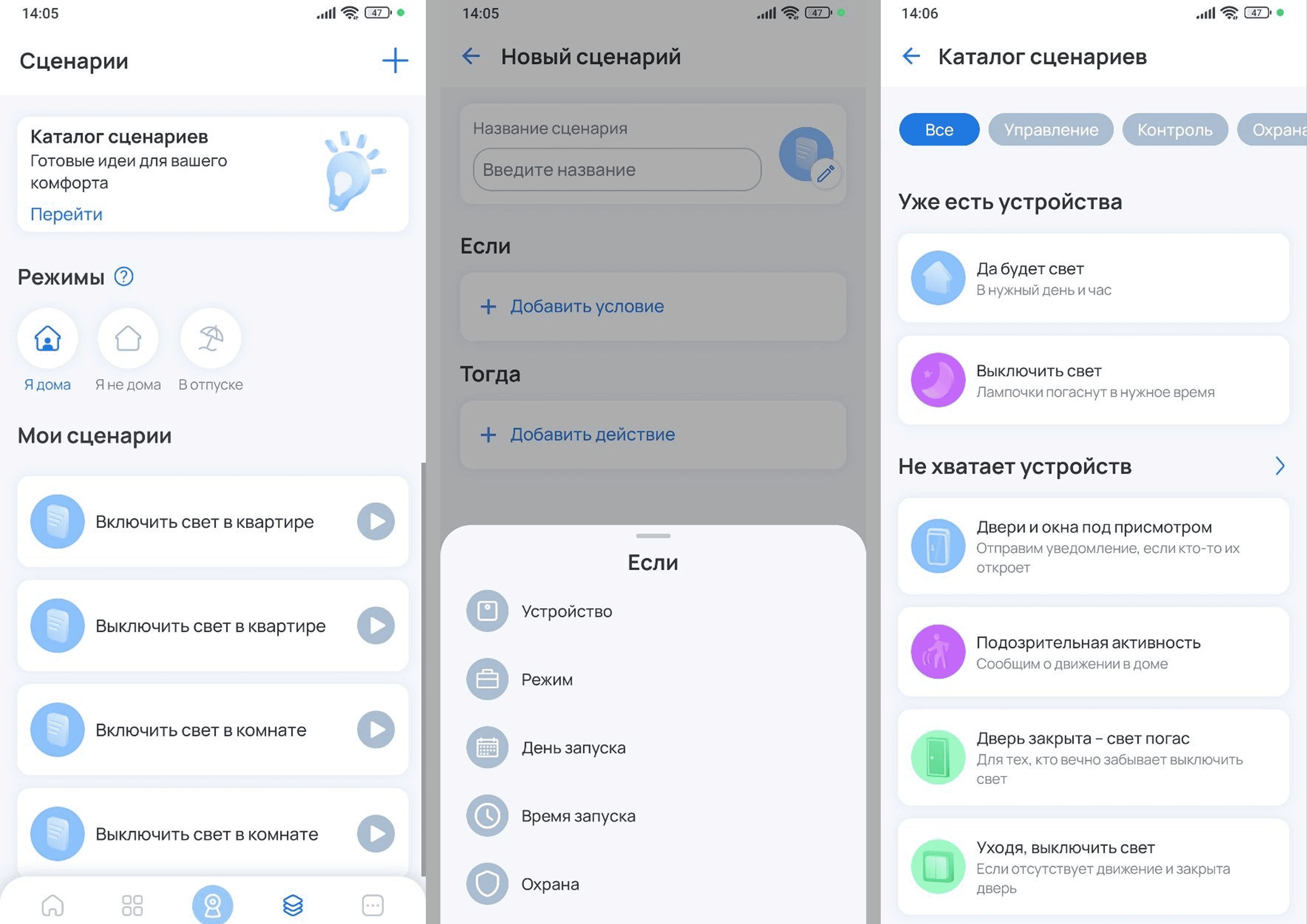 Через удобный интерфейс приложения пользователь взаимодействует со всеми подключёнными смарт-устройствами: настраивает их, следит за состоянием дома, создаёт сценарии и получает уведомления о важных событиях.