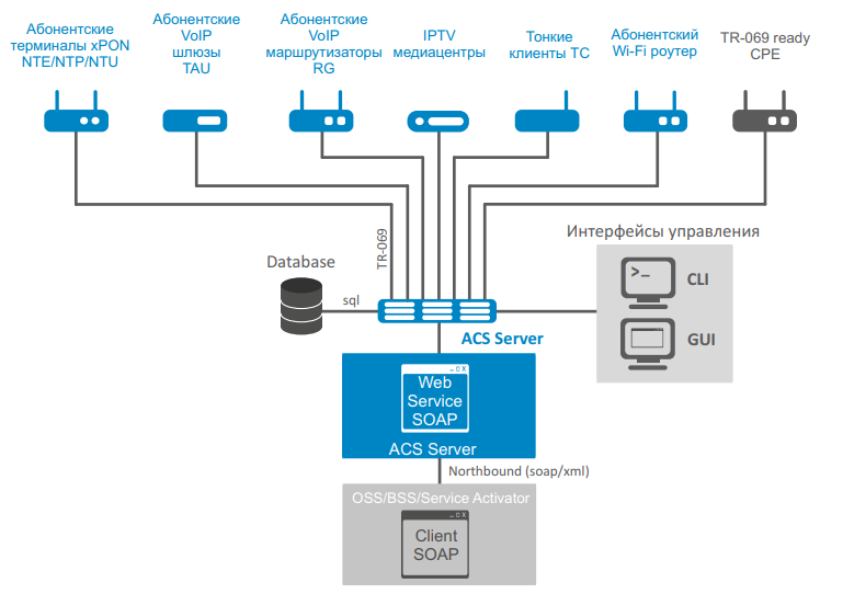 Управление сервером ACS доступно через интерфейс NorthBound, что даёт возможность полноценного взаимодействия с OSS. Это обеспечивает возможность подстройки всех элементов сети для подключения нового абонента в предельно короткие сроки с минимальной затратой инженерных ресурсов.
