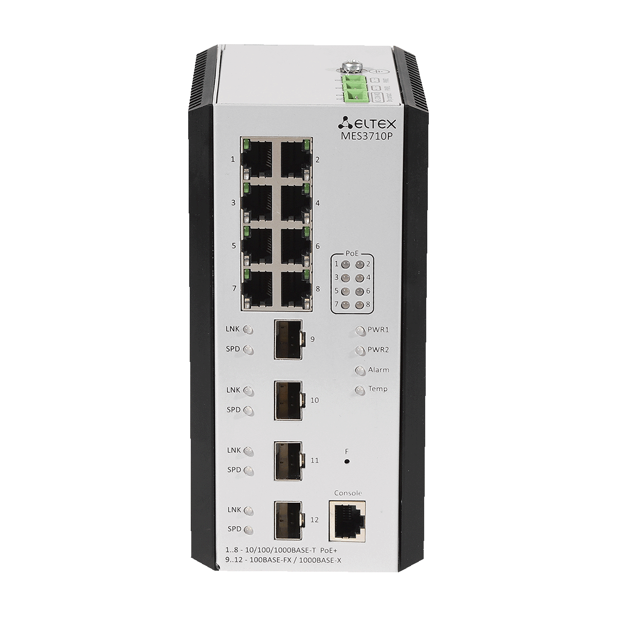 Коммутатор MES3710P предназначен для организации защищенных отказоустойчивых сетей передачи данных на объектах, где необходимо выполнение требований по обеспечению устойчивости к воздействиям различного вида: температурным, механическим, вибрации и другим.