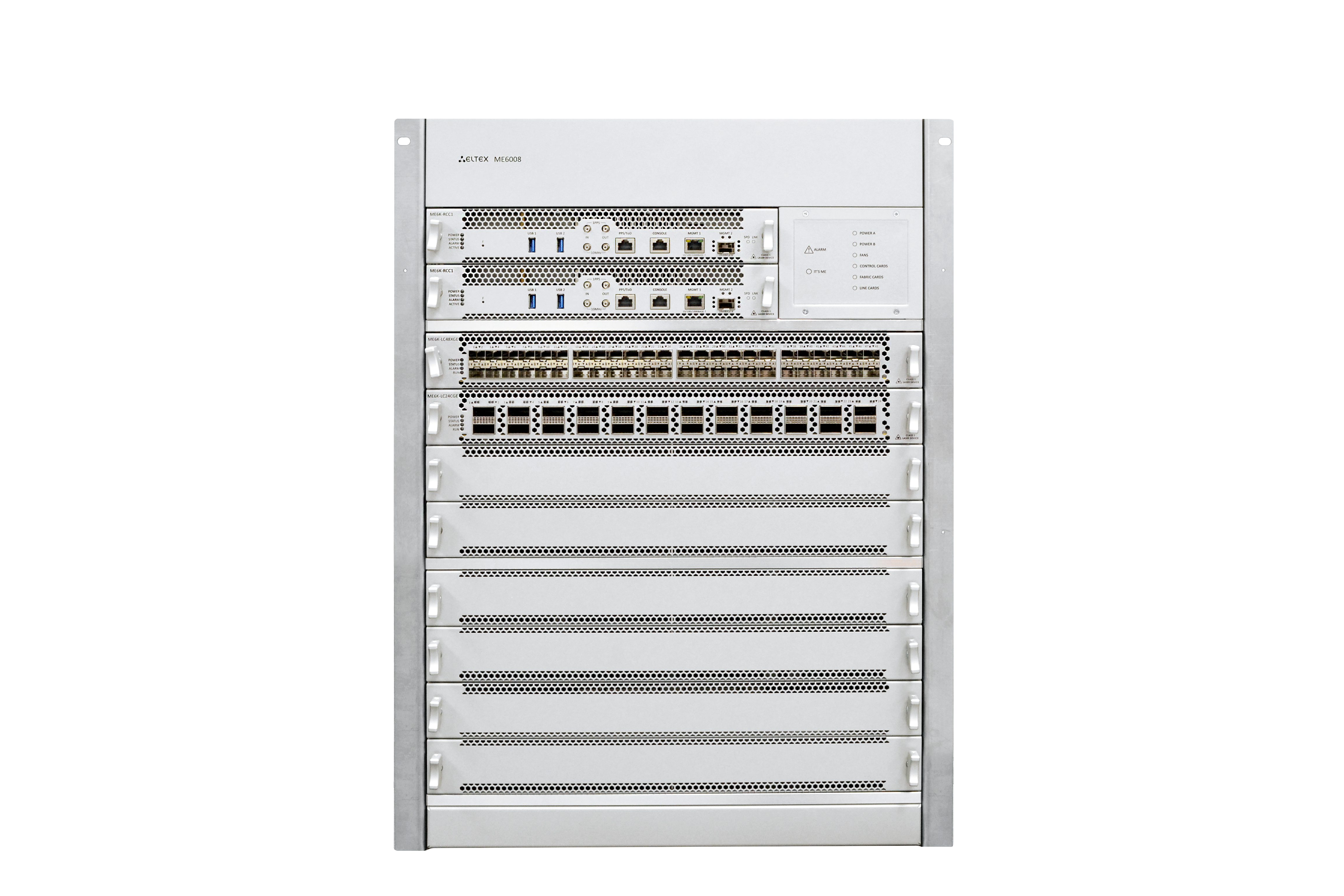Модульная архитектура ME6008 обеспечивает возможность масштабирования и создания аппаратной конфигурации устройства, соответствующей различным требованиям по производительности, по типам и составу сетевых интерфейсов.